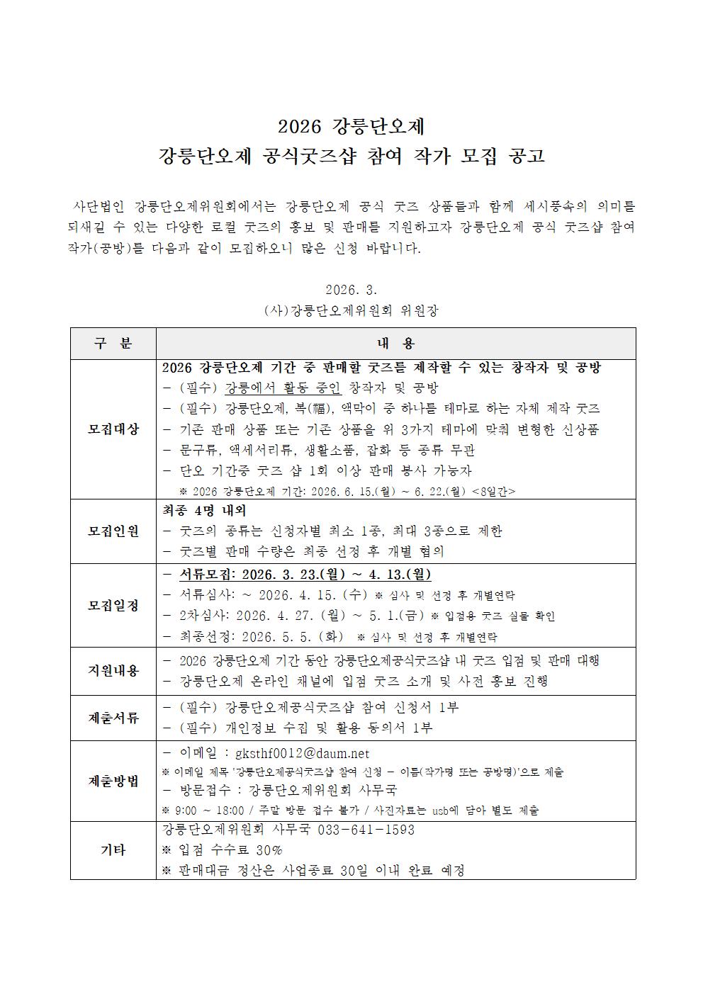 2026 강릉단오제 공식굿즈샵 참여 작가 모집 공고.hwp (180 KB)