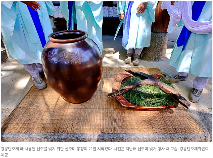 21일 유네스코 인류무형문화유산이자 국가무형문화재인 ‘강릉단오제’가 신주를 빚기 위해 쌀을 바치는 ‘신주미(神酒米) 봉정’으로 서막을 알렸다. 강릉단오제위원회는 강릉단오제의 시작을 알리는 신주미 봉정 행사를 21일부터 다음 달 21일까지 진행한다고 밝혔다.