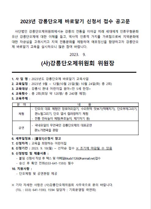 2023 강릉단오제 바로알기 교육사업 참여 어린이집 모집
