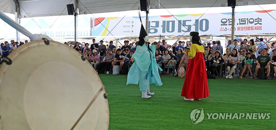 단오를 하루 앞둔 9일 천년 축제이자 유네스코 인류무형문화유산인 강릉단오제가 열리고 있는 강릉시 남대천 단오장에서 관노가면극 공연이 흥겹게 펼쳐지고 있다.